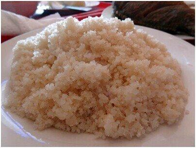 科特迪瓦最地道的主食自然是Attiéké,在網上找不到中文譯名。Attiéké簡單來說是把木薯捻碎了發酵成顆粒物的一種糧食,長相和口感都非常類似北非的小米飯古斯古斯,但是略有一點兒發酵的酸味,除此之外我覺得沒啥味道,個人不是太喜歡。