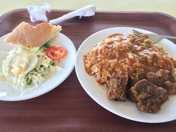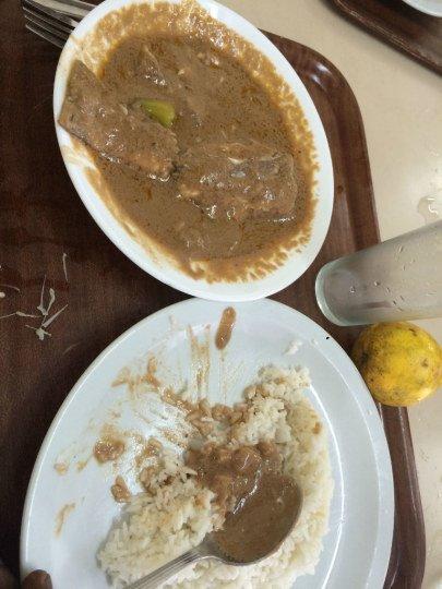 下面兩張是我中午在公司食堂吃的工作餐,算是典型的當地菜,前者是我的習慣,后者澆上醬汁是當地人的習慣。