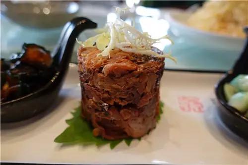 酥鯽魚:首先這是一道涼菜,鯽魚燒到骨頭全部酥軟,帶著凍上來,吃一口醬香濃郁,醋香也很明顯,酥軟的魚骨口感特殊。