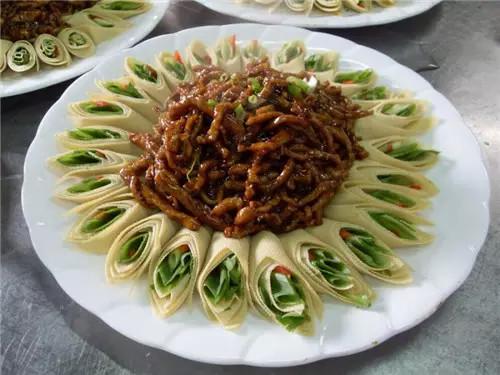 京醬肉絲:這道菜名氣比較大,豆腐皮卷著甜面醬炒的肉絲吃。