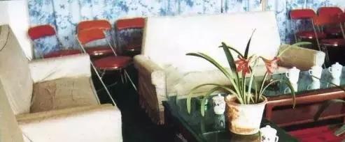 這里應該是這家旅社的一個會議室。那個年代的沙發、金屬折疊椅,傳統的茶幾上的水杯煙灰缸,還有君子蘭的花盆。充滿著那個年代會議室的特色。