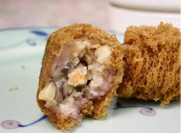 又到了鼠二最喜歡的“芋頭”食品了。芋頭剁成泥做皮,里面裹著炒熟的豬肉、蝦肉、冬菇餡料,包成角狀,然后油炸至金黃色。芋角外皮酥脆,里面的餡料香軟。
