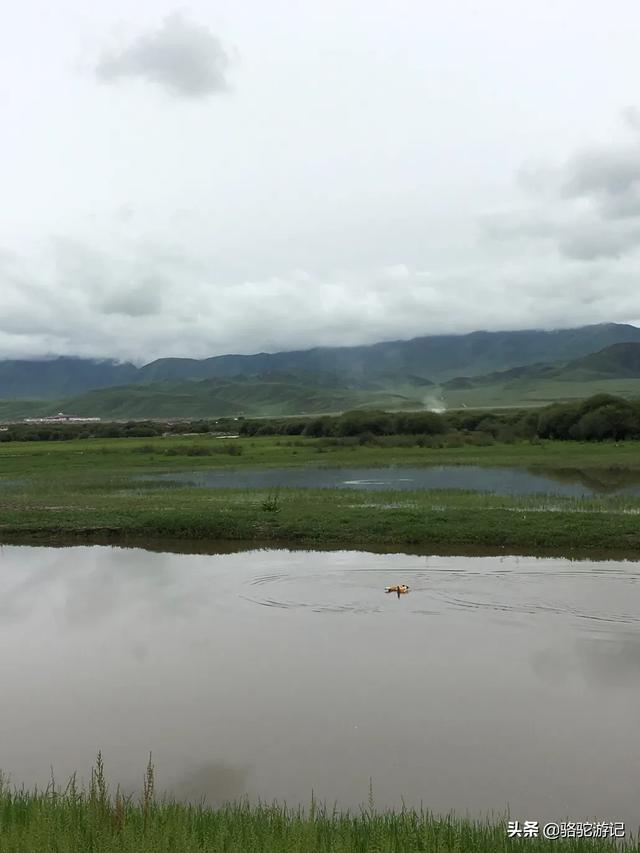 第二站是離拉卜楞寺不遠的??撇菰_@片草原真是太漂亮了,如果是晴天那更是美的一塌糊涂。目能所及的地方都是一片綠色,站在觀景臺向遠處眺望,高山、草地、河流,多么美的一幅畫。