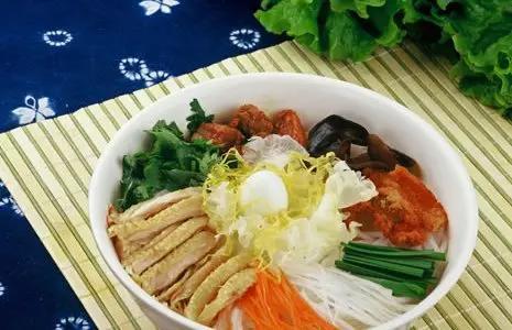 涼雞米線涼雞米線主要是由雞絲和米線制成,雞絲需要煮熟,以核桃醬和小粉做成鹵汁,搭配著辣椒汁和蒜末,為了美觀通常還會撒些蔥花和芝麻,吃起來微辣,恰好的酸味,雞肉的嫩和米線的香混為一體,極為爽口,很快就能將一碗滑下肚。