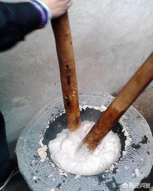 說起家鄉過年的美食,我腦海中浮現的第一個畫面就是幾個大漢拿著木錘在“打粑粑”的場景,“一二,嘿喲,一二,嘿喲”,喊起口號,有節奏的錘打著蒸熟的糯米飯。這個美食就是過年粑,其他地方也叫做“年糕”。年糕,顧名思義就是過年的時候才做的,而實際上也是如此。我們這里的年糕是用自家的糯米來泡之后進行蒸,蒸熟就放到一個特定的石頭容器里面,用人力進行捶打,打成糕狀,用手抓取乒乓球大小的團子,捏成餅狀,涂上一些黃油,就算完成了。