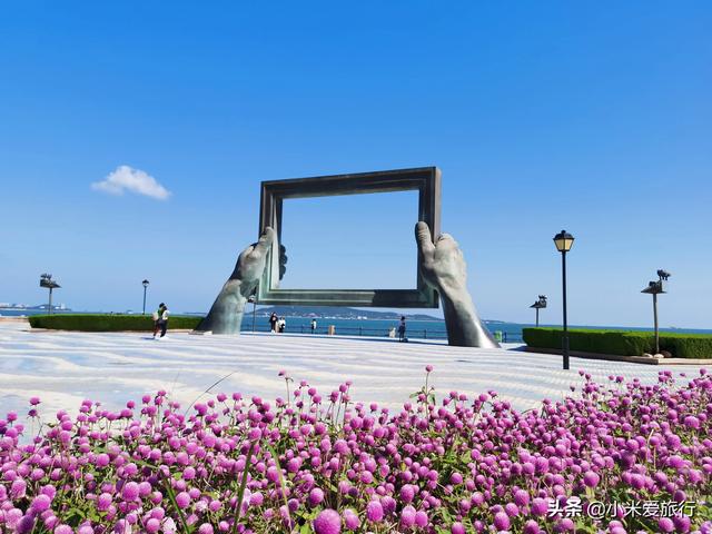沿海邊步道再向北走2公里,就是威海公園了,威海著名的地標雕塑“畫中畫”就建在這里。透過大大的畫框來欣賞海天一色的美景,別有一番意境。