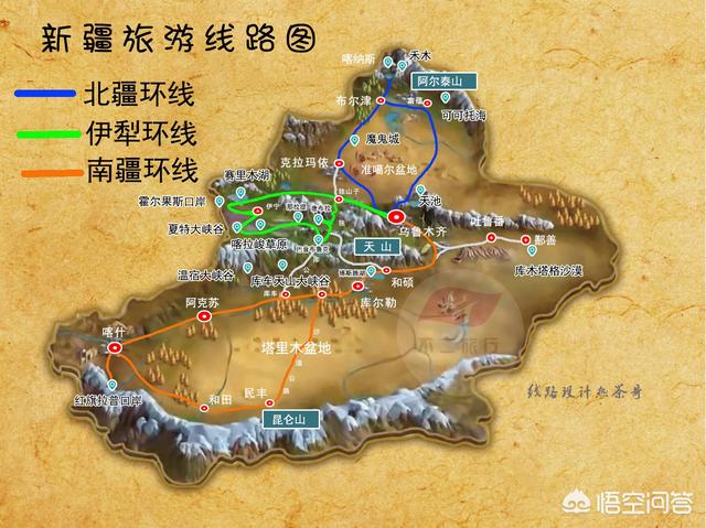 從上圖可以看出,新疆的景點主要集中在山區為主(阿爾泰山、天山山脈),以新疆三山加兩盆的地理特征通常以北疆環線、伊犁環線、南疆環線劃分,這三條線路又可以相互組成不同的線路。